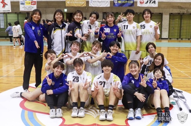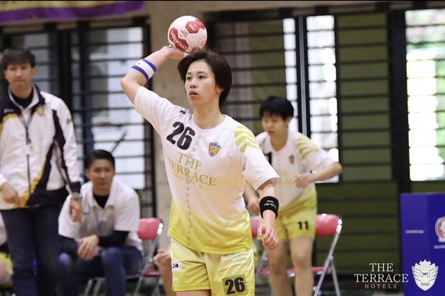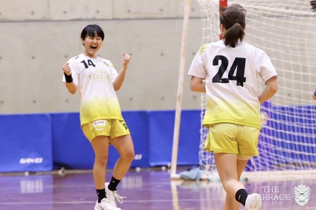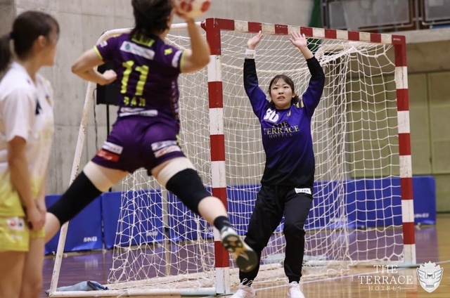 テラスホテルズのスローオフで、前半スタート。開始直後、No.26 竹内のカットインやNo.7 杉本の7メートルスローがキーパーに阻まれるも、No.24 大樋とNo.26 竹内の連携で、テラスホテルズが先制点をとる。しかしすかさず、相手に点数を取られ、そこから3失点連続で取られる。そこからNo.14 當山のカットインや相手のカットインシュートを止めるNo.18 田口のナイスセーブなど流れを変えれる場面はあったものの終始OFが攻めきれずに、3対9まで離される。